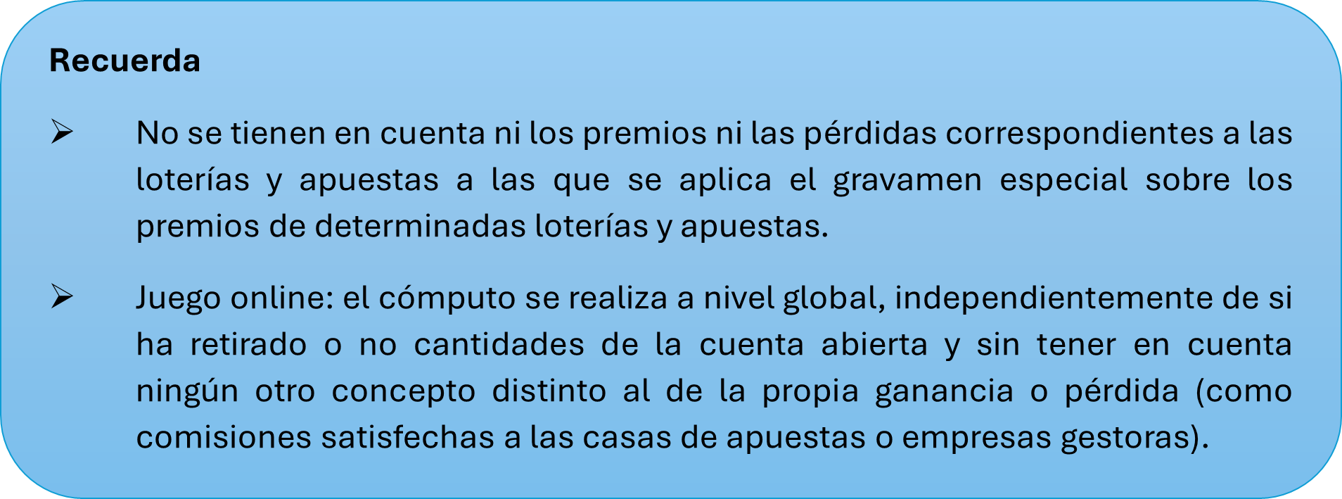 Las pérdidas obtenidas en el juego solo se pueden compensar con las ganancias obtenidas en el juego en el mismo período impositivo. El exceso no se puede compensar con ningún otro tipo de renta. Por ejemplo, si un contribuyente gana 1.000 € en apuestas deportivas pero pierde 1.500 € en el mismo año, solo podrá computar una pérdida de 1.000 € para compensar la ganancia, dejando el saldo neto del juego en cero. Los 500 € de pérdida neta no se pueden deducir de otros rendimientos o ganancias patrimoniales.